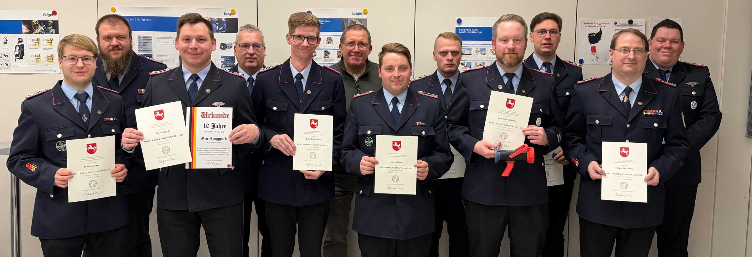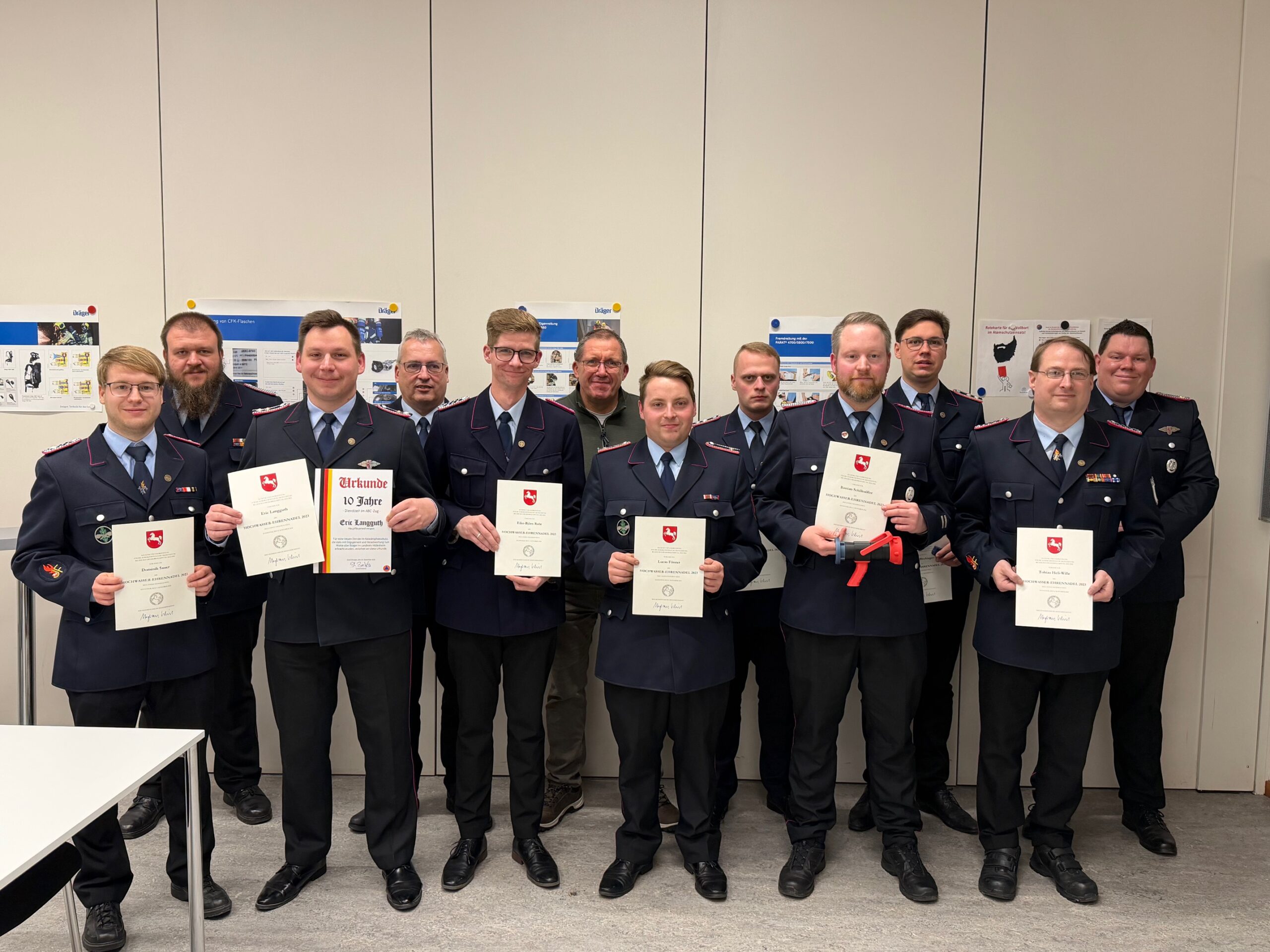Zur Jahresdienstversammlung des ABC-Zuges der Kreisfeuerwehr Hildesheim begrüßte Zugführer Philipp Bartels zahlreiche der insgesamt mehr als 50 Mitglieder des Fachzuges und Gäste aus Verwaltung, Kreisfeuerwehr und weiteren Hilfsorganisationen, mit denen eine intensive Vernetzung besteht. Die Einheit zeichnet sich durch enge Zusammenarbeit mit anderen Organisationen, schnelle und flexible Reaktion bei Notlagen und durch eine kontinuierliche Aus- und Weiterbildung aus; für dieses hohe Engagement, das sich in mehr als 6180 Stunden (43 Ausbildungsdiensten,14 Einsätze) ehrenamtlichen Engagements abbildet, dankten der Einheitsführer und die Gäste ausdrücklich. Besondere Höhepunkte des Jahres waren die Übernahme des „CBRN-Erkundungsfahrzeugs“ (chemisch/biologisch/radioaktiv/nuklear) aus Bundesmitteln und die Mitwirkung an einer 30-Stunden-Übung mit Zivilschutzeinheiten und der Bundeswehr im Solling.