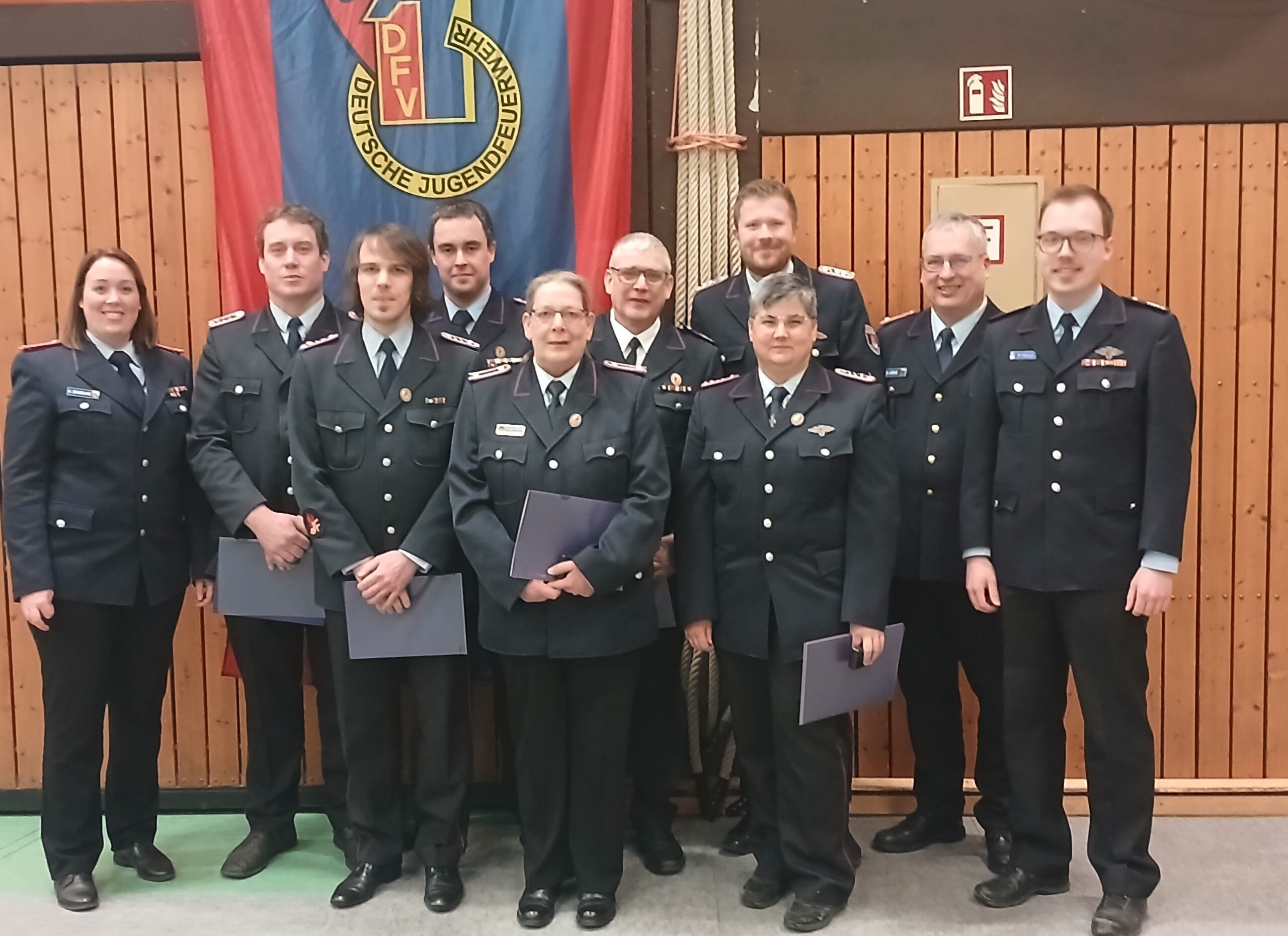 Somit waren fast 80 % der 91 Kinder- und 108 Jugendfeuerwehren des Landkreises Hildesheim vertreten; insgesamt sind über 2.800 Kinder und Jugendliche zwischen 6 und 18 Jahren in den Nachwuchsorganisationen der freiwilligen Feuerwehren engagiert. „Gemeinsam arbeiten, keinen zurücklasen – kurz gesagt: Vertrauen schaffen, das wir Kameradschaft nennen“ – so fasst Engelke das Arbeiten in den Gruppen zusammen. Neben Feuerwehrthemen steht auch immer die Unterstützung bei der Bildung einer persönlichen und sozialen Kompetenz im Mittelpunkt der Treffen. Insgesamt wurden mehr als 100.000 ehrenamtliche Stunden geleistet. Dazu gehören weiterhin Lehrgänge, Wettbewerbe und Ausbildungsnachweise der Jugendflammen I-III und der Leistungsspange. Mehrere 100 Kinder haben sich dieser Herausforderung gestellt, die den Nachweis eines Ausbildungsstandes darstellt und kein reines Leistungsabzeichen ist. Als Gäste der Veranstaltung begrüßte die Kreisjugendfeuerwehrwartin Vertreter aus Politik und Verwaltung und der Feuerwehr; Kreisbrandmeister Mathias Mörke fand lobende Worte für die Ausbilderinnen und Ausbilder und dankende für das Engagement der Kinder und Jugendlichen: „Es läuft bei euch!“ fasste er seinen Eindruck zusammen und betont, dass funktionierende Kinder- und Jugendfeuerwehren der Garant für leistungsfähige Einsatzabteilungen darstellen. Bei den Neuwahlen wurden Mark Bertram zum stellvertretenden Kreis-Jugendfeuerwehrwart, Nathalie von Blohn als Fachbereichsleitung Lehrgangsarbeit, Natalie Fischer als Schriftführerin und Jan Küchelmann als Fachbereichsleiter Material einstimmig gewählt. Maik Marschner (Esbeck), Christoph und Yannik Marzarin (Elze (Han.), Iris Wegner (Ahrbergen), Ralf Weißmann (Sehlem), Sandra Hamelmann (Heyersum) und Jochen Müller aus der Landwehr (Freden) wurden für außergewöhnliche und herausragende Leistungen mit dem Ehrenzeichen der Niedersächsischen Kinder- und Jugendfeuerwehr ausgezeichnet.