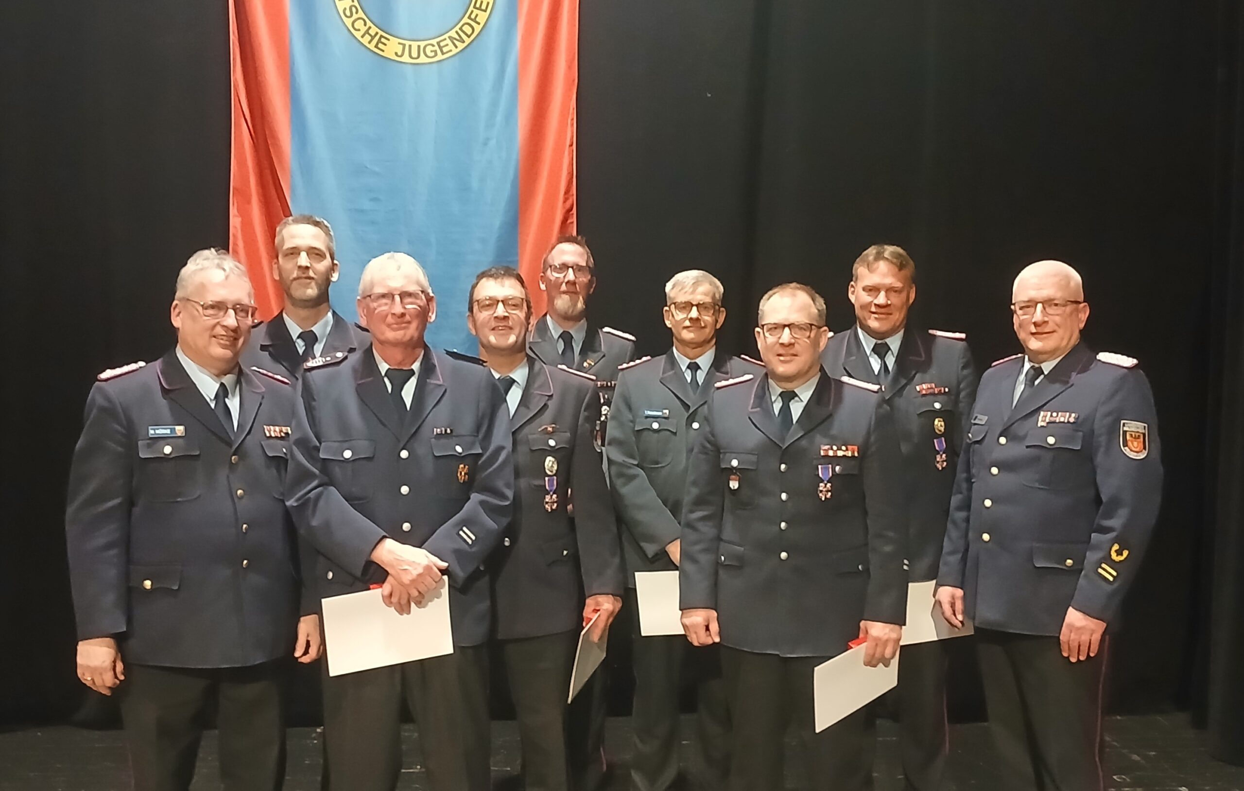 (ga) Mehr als 300 Delegierte aus den Feuerwehren des Landkreises, nämlich 315 Vertreter der Orts- und Gemeindefeuerwehren, erhoben sich zu Ehren der Geehrten Thorsten Pietschmann (FF Holle), Stefan Behme (FF Harsum), Thorsten Steinfoff (FF Freden), Stefan Marhauer (FF Alfeld), Florian Beitzen (FF Algermissen), Erik Franz (FF Freden) -alle das Deutsche Feuerwehrehrenkreuz in Silber- und Udo Ritterott (FF Freden) -Deutsches Feuerwehrehrenkreuz in Gold- zu einem beeindruckenden „Gut Wehr“ von ihren Plätzen.