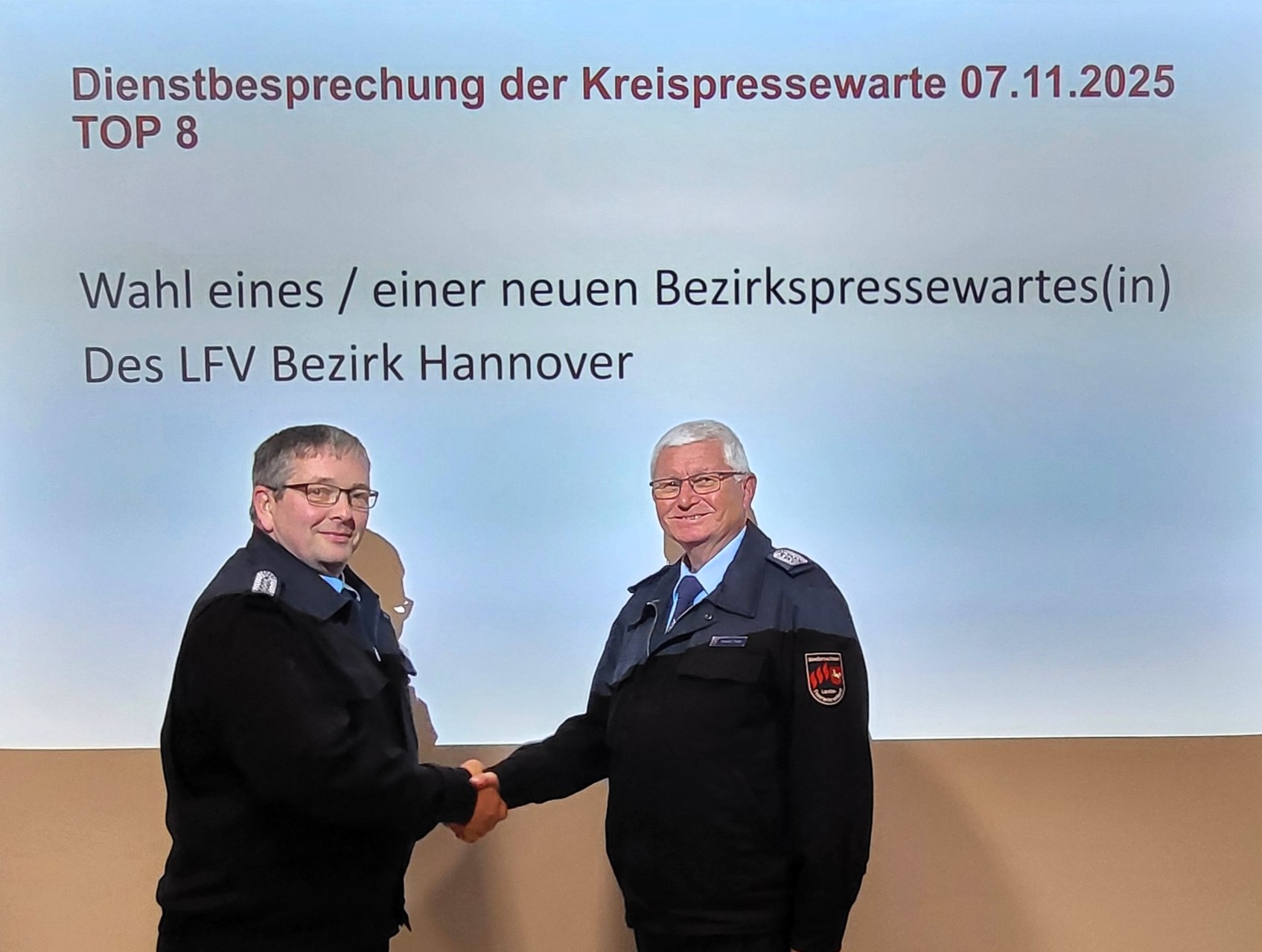 Im Rahmen der Versammlung wurden der Kreisinternetbeauftragte unseres Verbandes, Matthias Quintel und der Kreispressewart der Region Hannover, Armin Jeschonnek verabschiedet. Da der Bezirkspressewart Harald Nülle mit Erreichen der Altersgrenze sein Amt abgeben muss, wurde aus dem Kreis der Pressewarte Sven Geist aus dem Landkreis Schaumburg einstimmig zum neuen Bezirkspressewart gewählt. Diese Wahl muss jetzt von der Versammlung der Bezirksfeuerwehr bestätigt werden und im Anschluss noch vom Vorstand des LFV. Danach erfolgt dann die Ernennung durch den LFV.